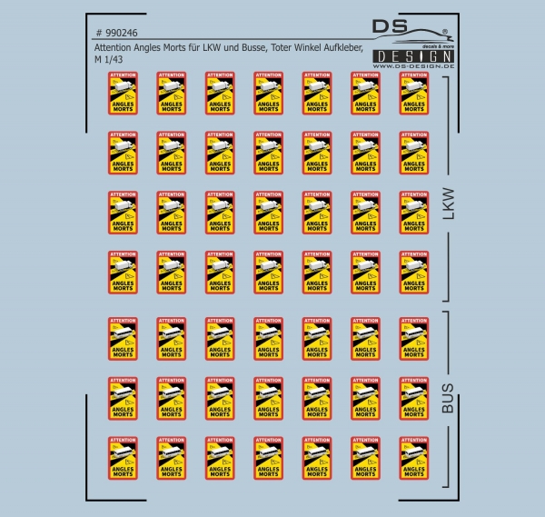 Das Decal 990246 bildet die typischen Warnhinweisschilder „Toter Winkel“ bei LKW, Busse, Wohnmobilen, Transporter etc. im Maßstab 1/43 ab. Diese Hinweisschilder sind ab dem 01.01.2021 in Frankreich Pflicht und müssen sowohl am Heck als auch auf der Beifahrerseite angebracht werden. Die Anbringungshöhe sollte keine 90 cm unterschreiten, ebenfalls keine Höhe von 150 cm überschreiten. Bei Sattelzügen sollte der Aufkleber in Höhe der Hinterachse der Zugmaschine angebracht werden.