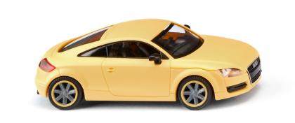 WIKING spendiert dem Audi TT Coupé sportlich strahlende Frische – der gelbe Lack macht’s möglich. Das Audi TT Coupé der zweiten Generation war mit seinem Fließheck auf Anhieb sportlicher als sein Vorgänger – die Hoffnungen des Herstellers beim Marktstart waren dementsprechend groß. Auch die Premiere sorgte am 6. April 2006 für ein großes Echo, fand sie doch vor dem Brandenburger Tor in Berlin statt. Einen Tag später stand die neue Generation des Audi TT Coupé dann auf der Automesse AMI Leipzig im Mittelpunkt des Publikumsinteresses. Die 87-fache Verkleinerung schrieb die unverwechselbare Audi-Klarheit in seinen ursprünglichen Formen fort, befreite sich aber von den typischen Audi-Rundungen der Neunzigerjahre. Die Seitenlinie schien auf den ersten Blick athletischer zu wirken, das beim Vorgänger runde Heck wirkt kraftvoller. Karosserie sunflower yellow lackiert mit Klarlackfinishing, Fahrgestell, Außenspiegel und Inneneinrichtung schwarz. Kühlergrill und Lüftungen schwarz gehalten und mit silbernem Zierrat veredelt. Felgen basaltgrau mit gelber Umrandung. Frontscheinwerfer transparent, Heckleuchten rottransparent eingesetzt. Audi-Logo vorn und hinten silbern bedruckt. Heckseitig zusätzlich silbern bedruckte TT-Lettern.
