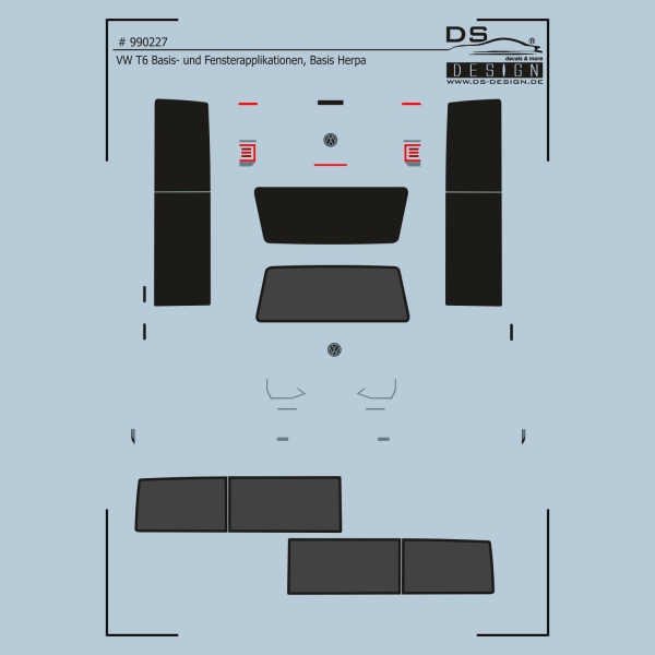Das Decal # 990227 bildet die Basis- und auch Fensterapplikationen für den VW T6 für das Basismodell von Herpa an. Rückleuchtenimitationen sorgen ebenfalls für die vorbildkonforme Darstellung des Modells. So können Sie also nach der Lackierung Ihr Modell entsprechend vervollständigen.