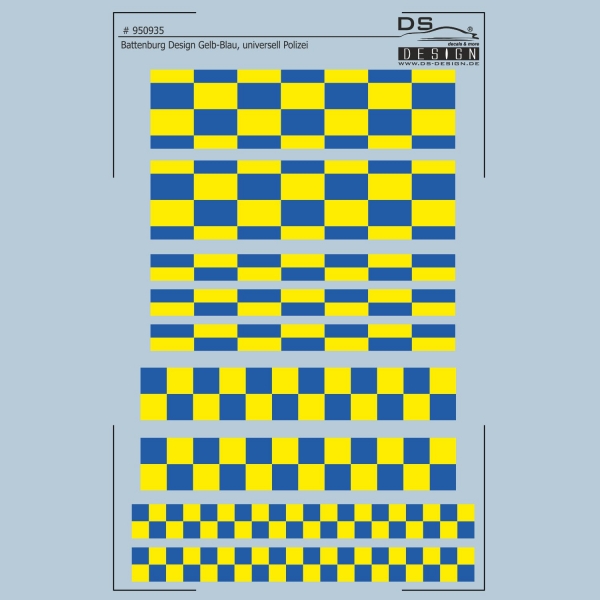 Dieses Universaldecal beinhaltet das Battenbergdesign in Hellgelb und Blau für die Polizei. Da es verschiedene Hersteller und auch verschiedene Größen und Formen der Flächen gibt, haben wir auch drei verschiedene Flächen zur Auswahl. Bedingt können diese kombiniert werden. Allerdings sind aber die verschiedenen Höhen und Breiten zu beachten. Die Flächen auf einem Bogen sind voll kombinierbar.