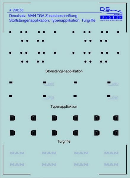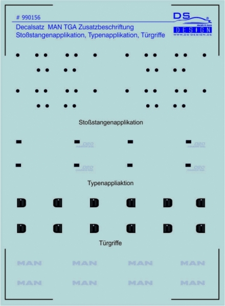 Das Decal # 990156 kann für die Ergänzung von Großserienmodellen genutzt werden. Hiermit können die schwarzen Verschraubungen an der Stoßstange, zusätzlich noch Typenbezeichnungen etc. dargestellt werden.