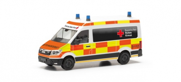 Auch das BRK (Bayerisches Rotes Kreuz) setzt nun auf das Karo-Muster an den Fahrzeugen. Dieser brandneue MAN TGE ist auf dem neusten Stand, was die Beschriftung des BRK angeht. Mit Dachklima und ergänzenden Detaildrucken kommt das Modell dem Original sehr nahe.