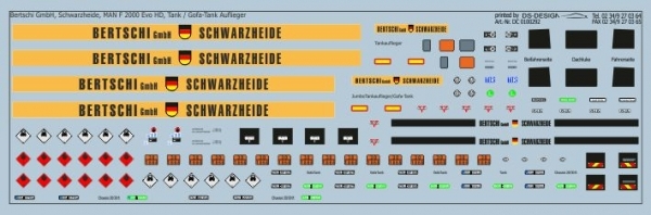In dem Decal DC0100292 ist die Bertschi Beschriftung für einen Tankauflieger oder auch wahlweise für den Gofa-Tank Auflieger enthalten. Somit können hier zwei Tankauflieger mit diesem Decal beschriftet werden. Die komplette Fahrerhausbeschriftung und entsprechende Gefahrguttafeln mit Kemnazahlen und diverse authentische Kennzeichen runden das Decal ab.