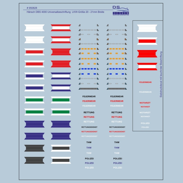 Bei dem Decal # 950828 handelt es sich um einen Beschriftungssatz des DBS 4000 Blaulichtbalken der Fa. Herpa. Die Artikel-Nr. lautet H053815.