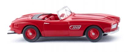 Tatsächlich ist der BMW 507 deutlich kompakter und auch im Hinblick auf die erreichten Stückzahlen und erhalten gebliebener Exemplare deutlich seltener als der 300 SL. Lediglich 252 Einheiten wurden zwischen 1956 und 1959 ausgeliefert – der Preis lag damals bei rund 26.000 Mark. Bis heute stieg der Sammelwert auf über 700.000 Euro. Bei WIKING zählt der BMW 507 inzwischen zu den Klassikern aus neuen Formen und damit zu den Meilensteinen der deutschen Automobilhistorie. Karosserie in rot, rote Einrichtung mit weißem Lenkrad und Verdeckeinsatz in schwarzgrau. Fahrgestell in schwarzgrau. Stoßstangen und Felgen chromsilber eingesteckt. Zierleisten und Kühlergrillrahmen sind vorbildgerecht gesilbert, ebenso die Lufteinlässe vorn. Rückleuchten rot bemalt.