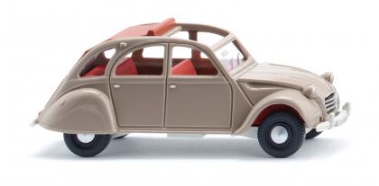 Faltdach zurückgerollt und fertig war das Open-Air-Vergnügen der jungen Augenfahrer, die mit der „Ente“ ihre Liebe zum ersten Auto dokumentierten. Denn keine „Studentenschleuder“ gilt als so legendär wie der Citroën 2 CV – die zuweilen bedrohlich hin und her schaukelnden Kurvenfahrten sind unvergessen. Der eine oder andere Beifahrer schnappte dank geöffnetem Faltdach nach erlösender Luft. In Deutschland schaffte es die Ente vom automobilen Alltagsfranzosen der ersten Nachkriegsjahre zum studentischen Kultauto der 1970er-Jahre zu werden – Flowerpower pur. Raumenge, Leistungsbegrenztheit und Kurvenneigung wurden von den Fahrern, allen Unkenrufen zum Trotz, zu Vorteilen der Ente proklamiert – der 2 CV wurde in 1:1 genauso geliebt wie die 87-fache Verkleinerung. Karosserie olivgrau, Inneneinrichtung mit Lenkrad korallenrot. Fahrgestell mit Kühlergrill grauweiß. Offenes Faltdach kupferbraun. Scheinwerfer, Kühlergrill und Logo vorn sowie seitliche Türgriffe gesilbert. Rücklichter rot bedruckt.