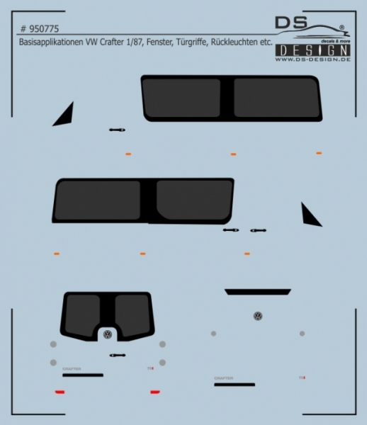 Bei dem Decal # 950775 handelt es sich um Fensterimitationen und Basisapplikationen für ein Herpa-Modell des VW Crafter. Somit kann aus einem Kastenwagen eine Busvariante gestaltet werden.