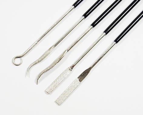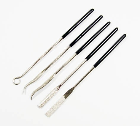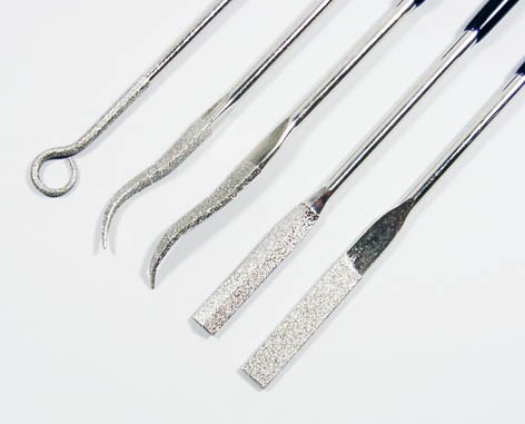 Ein Set mit fünf verschiedenen Riffelfeilen in sehr guter Qualität, die mit einer galvanisch gebundenen Diamantbeschichtung ausgestattet sind. Diese Feilen sind geeignet für Arbeiten an Stellen, wo andere Feilen nicht mehr hinkommen.