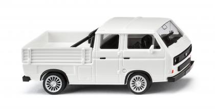 Warum eigentlich nicht? Der VW T3 mutierte noch zu Produktionszeiten zu einem beliebten Freizeitgefährt. Die Doppelkabine und die kurze Pritsche dahinter mit darunterliegendem Werkzeugkasten sorgten für Sympathie bei all denjenigen, die in jenen Jahren einen Pickup aus deutscher Produktion vermissten. Mit einem Überrollbügel wurde dem Bulli aus Hannoveraner Produktion kurzerhand sportliches Flair eingehaucht – WIKING miniaturisierte ein Vorbild aus jenen Jahren in 1:87. Der VW T3 war einst die dritte Generation des VW-Transporters, der das Straßenbild der Achtzigerjahre in Deutschland und Europa prägte. Der T3 wurde von 1979 bis 1992 produziert und war zugleich die letzte Transporter-Baureihe mit Heckmotor und -antrieb, was dem Vorbild bis heute in der Bulli-Chronologie Klassiker-Status verleiht. Karosserie und Pritsche weiß, Fahrgestell mit Kühlergrill und Lufteinlass schwarz. Inneneinrichtung mit Lenkrad schwarz. Schwarzer Überrollbügel und silber lackierte Sportfelgen. Vordere Blinker orange bedruckt, Rücklichter karminrot bedruckt. VW-Logo auf Kühlergrill in silber. Scheinwerfer per Hand gesilbert.