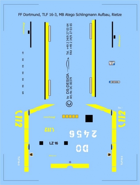 Das Decal DC00379 wird mit Vorbildfotos und Verarbeitungshinweisen geliefert. Es ist erstellt für Basismodelle der Fa. Herpa und bildet die Beschriftung eines TLF 16-3 MB Atego mit Schlingmann-Aufbau der Freiwilligen Feuerwehr Dortmund ab.