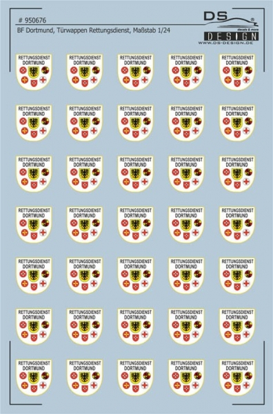 Dieses Decal # 950676 beinhaltet die Türwappen des Rettungsdienstes der Feuerwehr Dortmund im Maßstab 1:24. Das einzelne Wappen weist eine Breite von 12,5 mm und eine Höhe von 12,7 mm auf.