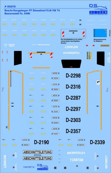 Es handelt sich hierbei um ein vor Jahren ausverkauftes Decal des ELW/NEF der BF Düsseldorf auf Basis des VW T4. Dieses Decal wurde komplett überarbeitet und neu aufgelegt. Das Decal wird im Digitaldruck auf einer ganzflächigen Decalfolie gedruckt. Die Druckwerke müssen konturenscharf ausgeschnitten werden.