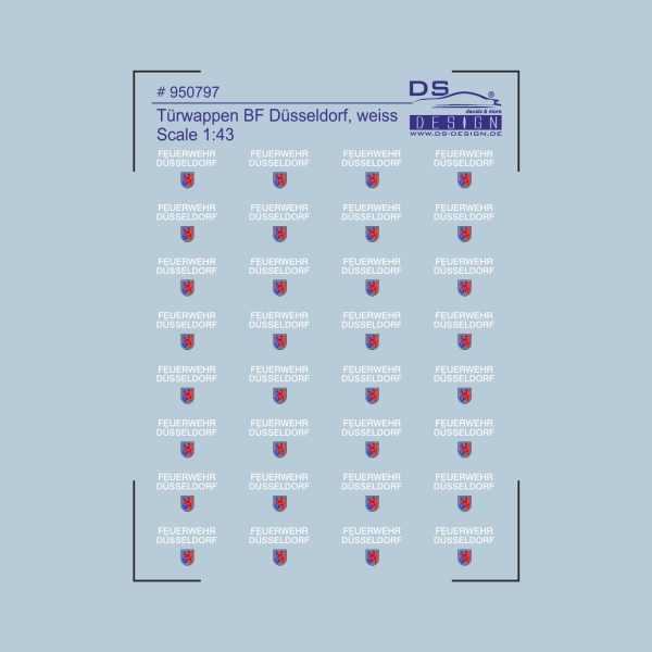 Das Decal # 950797 beinhaltet die aktuellen Türwappen (Stand 2017) der Feuerwehr Düsseldorf mit Schriftbild in Weiss zur Bestückung Ihrer Modelle oder auch der Großserienmodelle verschiedener Hersteller.