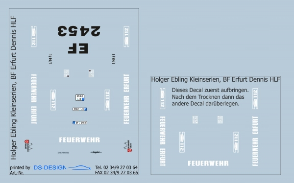 Dieses Decal ist speziell für die Kleinserienmodelle von HEK Holger Ebling Kleinserie konstruiert und passt auf das Kleinserienmodell des HLF auf Basis des Dennis Rapier HLF der Feuerwehr Erfurt.