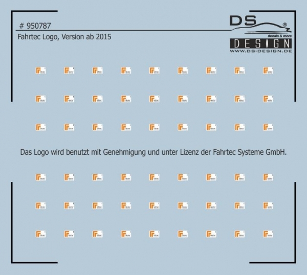 Das Decal # 950787 beinhaltet Logos der Fa. Fahrtec Systeme GmbH in der Höhe von 1 mm und einer Breite von 1,8 mm. Die 54 Stück abgedruckten Logos werden ab dem Baujahr 2015 bei Fahrzeugen verwendet. So können individuell gestaltete Modelle im Maßstab 1/87 damit bestückt werden.