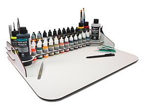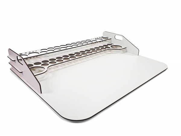 Farbständer für die Modellbauer-Werkstatt, aus gelasertem Holz. Für den Zusammenbau ist kein Kleben nötig. Bietet Platz für 45 Farbfläschchen mit 17 ml, 4 Farbfläschchen mit 35 oder 60 ml und 2 Farbflaschen mit 200 ml, sowie 10 Pinsel. Maße gebaut: 50 x 37 x 8,5 cm. Ohne Farben, Pinsel, Werkzeug.