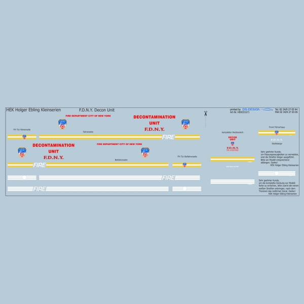 Dieses Decal ist speziell für die Kleinserienmodelle von HEK Holger Ebling Kleinserie konstruiert und beinhaltet die Beschriftung des F.D.N.Y. Decontamination Unit - Decon Unit als kompletten Beschriftungssatz der New Yorker Feuerwehr.