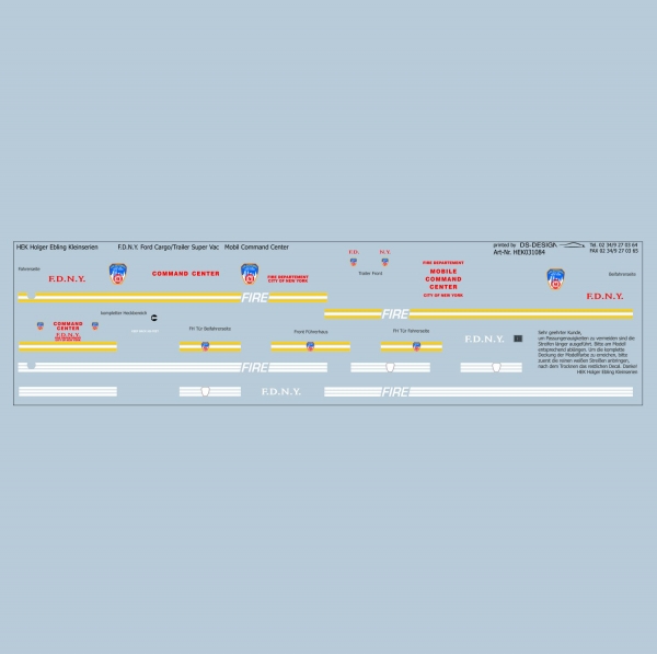 Dieses Decal ist speziell für die Kleinserienmodelle von HEK Holger Ebling Kleinserie konstruiert und beinhaltet die Beschriftung des F.D.N.Y. Mobil Command Center auf Ford Cargo Basis mit einem Super Vac Trailer als kompletten Beschriftungssatz der New Yorker Feuerwehr.