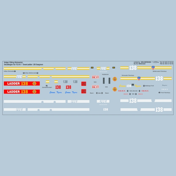 Dieses Decal ist speziell für die Kleinserienmodelle von HEK Holger Ebling Kleinserie konstruiert und beinhaltet die Beschriftung des F.D.N.Y. TowerLadder 138 Seagrave als kompletten Beschriftungssatz der New Yorker Feuerwehr.