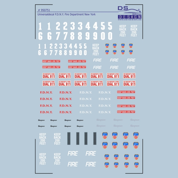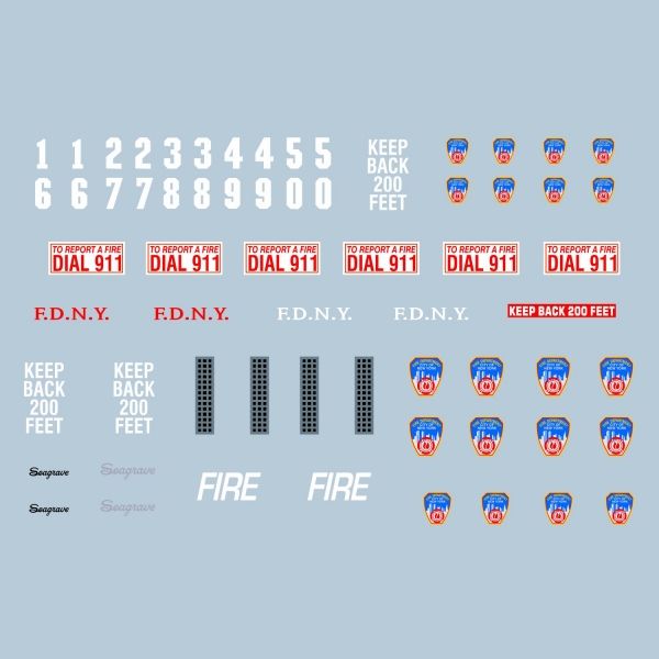 Ein Universaldecal des New Yorker Firedepartment, dass Wagennummern, Logos, Patches und Beschilderungen enthält.