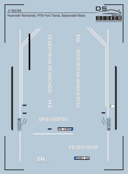 Das Decal # 950769 bildet die Beschriftung eines Mannschaftstransportwagens (MTW) der Feuerwehr Remscheid ab. Es ist für Basismodelle der Fa. Rietze erstellt und wird mit Verarbeitungshinweisen ohne Vorbildfotos geliefert.