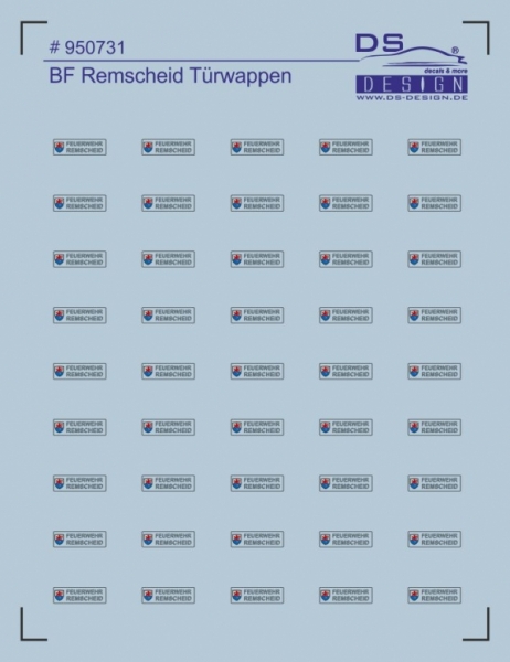 In diesem Decal sind ingesamt 45 Stück Türwappen der Feuerwehr Remscheid enthalten. Sie entsprechen dem Maßstab 1:87 und weisen eine Breite von 5,6 mm und eine Höhe von knapp 2 mm auf.