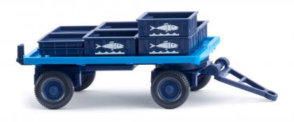 Diese Marke ist ein wirklicher WIKING-Klassiker! Denn mit der Werbung für Seefische erinnern die Traditionsmodellbauer an eine schon vor fünf Jahrzehnten populäre WIKING-Werbung, die sich schon in den frühen Fünfzigerjahren auf mehreren Modellen wiederfand. Jetzt steht der Flachpritschen-Anhänger in den Hausfarben von „Seefische“ bereit, um bei Bedarf mit dem Büssing 4500 ein Gespann zu bilden. Passend dazu gibt es die kleinen und großen Wannen, die farbgleich gestaltet sind. Die großen Wannen haben überdies noch das typische „Seefische“-Logo erhalten. Fahrgestell, Deichsel und Drehschemel saphirblau, Flachpritsche himmelblau. Saphirblaue Felgen und Kästenbeladung mit vier kleinen und fünf großen Wannen. Seitliche Bedruckung der großen Wannen mit „Seefische“-Logo.