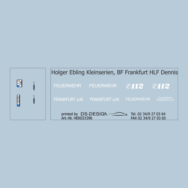 Dieses Decal ist speziell für die Kleinserienmodelle von HEK Holger Ebling Kleinserie konstruiert und passt auf das Kleinserienmodell des HLF auf Basis des Dennis Rapier HLF der Feuerwehr Frankfurt.