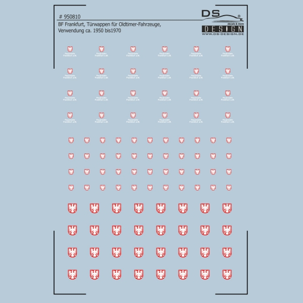 Das Decal # 950810 beinhaltet Türwappen der Feuerwehr Frankfurt, die hauptsächlich in den Jahren 1950 bis 1970 verwendet wurden.