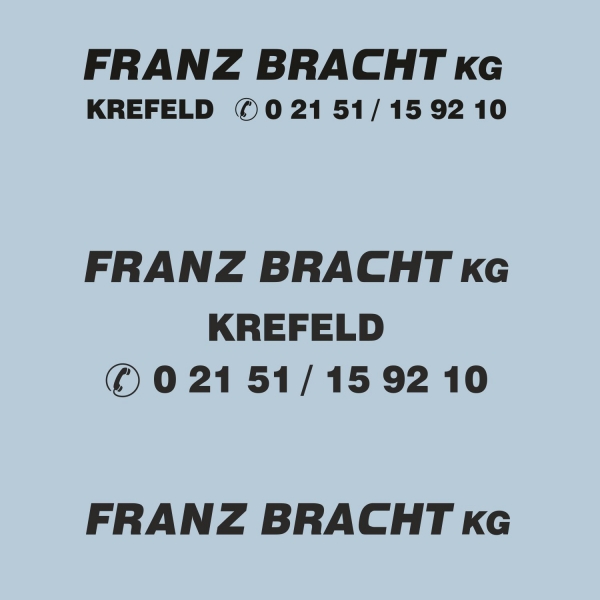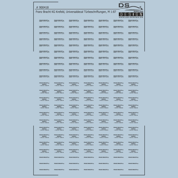 Das Decal # 900418 Franz Bracht KG Krefeld, Universaldecal Türbeschriftungen, M 1/87 ist ideal zur Bestückung von Großserienmodellen. Es bildet die Beschriftungen der Niederlassung in Krefeld ab. Das Decal wird Verarbeitungshinweisen geliefert.