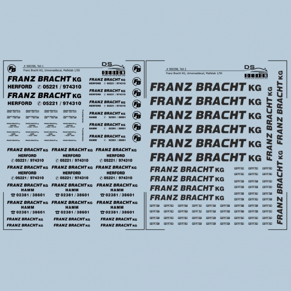 Das Decal # 900398 Franz Bracht KG Schwertransporte ist ein Universaldecal mit verschiedenen Logos, Schriften und Kennzeichen. Es bildet die Beschriftungen der Niederlassungen Herford und Hamm ab. Es wird mit Verarbeitungshinweisen geliefert.