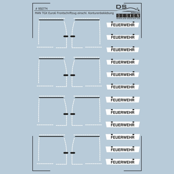Das Decal 950774 enthält den typischen Kölner Schriftzug Feuerwehr auf weißer Blende. Es passt für die Basismodelle der Fa. Herpa MAN TGX Euro 6. Die weiße Frontblende ist in zwei verschiedenen Versionen enthalten und ebenfalls sind in diesem Decal Konturenbeklebungen für die Fahrerhausseiten einschl. schwarzer Regenrinne und Spiegelapplikation abgedruckt. So können Sie Ihr Modell ganz individuell gestalten. Das Decal wird mit Verarbeitungshinweisen geliefert, die zusätzlich als Download bei diesem Artikel zur Verfügung stehen.
