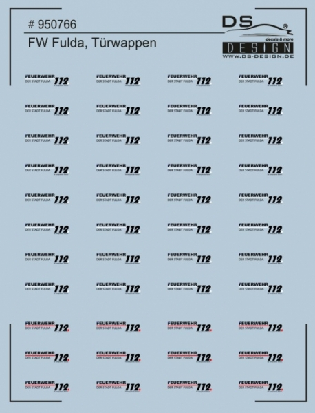 In dem Decal # 950766 sind zwei verschiedene Ausführungen an Türwappen der Feuerwehr Fulda enthalten. Insgesamt sind mit einer Breite von 7,4 mm 44 Stück Türwappen in diesem Decal/Naßschiebebild enthalten.