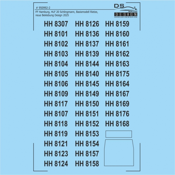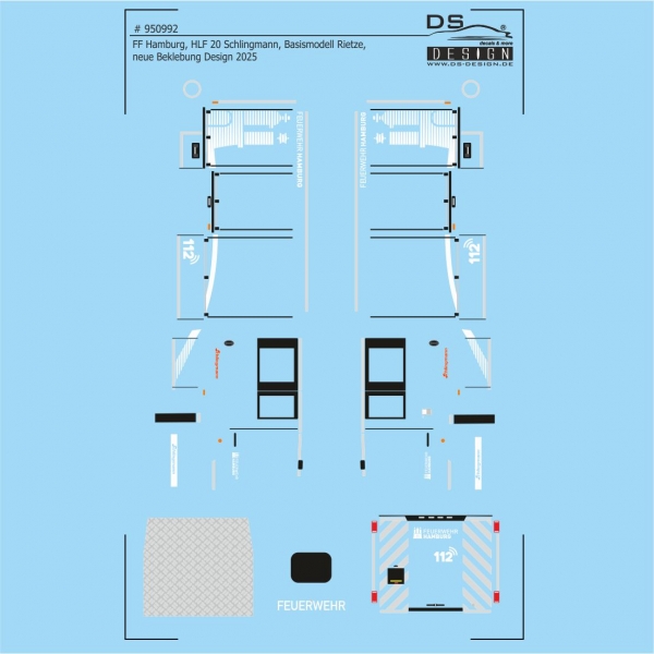 Dieses Beschriftungspaket der Feuerwehr Hamburg beinhaltet Decals für den Nachbau der neuen HLF 20 auf Atego/Schlingmann der Freiwilligen Feuerwehr Hamburg im neuen Design 2025. Die Decals sind passend für das HLF von Rietze. In dem Paket befinden sich geplottete leuchtrote Flächen und ein vollständiger Beschriftungssatz für den originalgetreuen Umbau im UV - Digitaldruck. Dabei sind alle Standorte mit Kennzeichen, Wachkennung, Wachwappen und Dachkennung enthalten. Zudem eine Schablone für einen Zuschnitt vom Riffelblech für das Dach und die Platte für die Dachkennung auf dem Riffelblech. Hierzu eignet sich eine Polystyrolplatte mit 0,13mm Dicke.