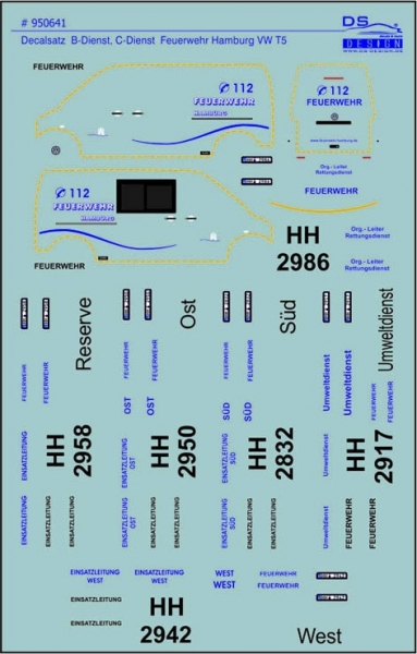 Das Decal # 950641 enthält alle im Jahre 2010 in Dienst gestellte ELW der B-Dienste der Feuerwehr Hamburg. Als Grundfahrzeuge dienen VW T5 mit langem Radstand und Mittelhochdach. Als Basismodell sollte das VW T5-Modell der Fa. Rietze verwendet werden.
