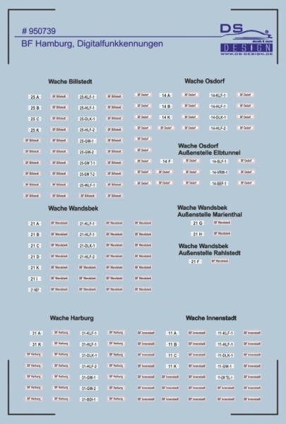 Das Decal # 950739 beinhaltet die digitalen Funkkennungen der Feuerwehr Hamburg für die Wachen Billstedt, Osdorf, Wandsbek, Harburg, Innenstadt und der Landesfeuerwehrschule. Ebenfalls sind die Außenstellen Elbtunnel, Marienthal und Rahlstedt mit berücksichtigt.