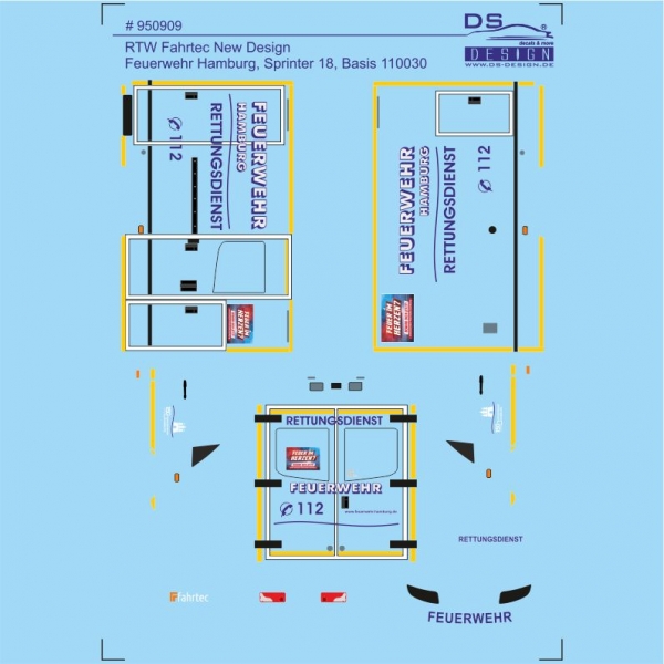 Bei diesem Decal handelt es sich um den Beschriftungssatz für die neue RTW Generation der Feuerwehr Hamburg mit Fahrtec New Design Aufbau. Der Decalsatz wurde passend für den Herpa Sprinter 18 Fahrtec mit dem TransKit Modell #10030 und dem leuchtroten Decalsatz 950910 ausgelegt.