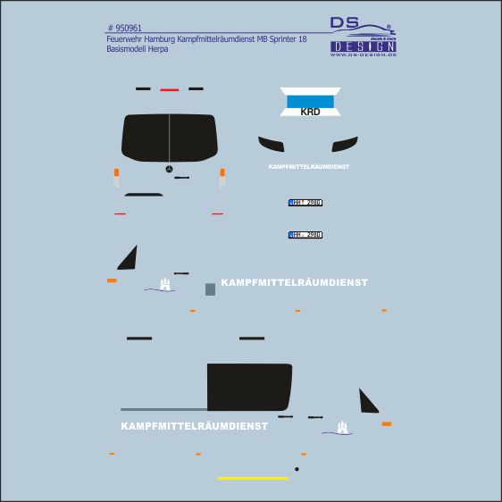 Der Kampfmittelräumdienst der Feuerwehr Hamburg hat Zuwachs bei den Fahrzeugen. Der MB Sprinter 18 ist im alten Design der Feuerwehr Hamburg beklebt. Das Decal enthält alle Details um das Modell vorbildgerecht gestalten zu können. Für den vorbildkonformen Umbau muss das Fahrzeug auf Allradachsen umgebaut und mit einer Seitenmarkise auf der Beifahrerseite vervollständigt werden.