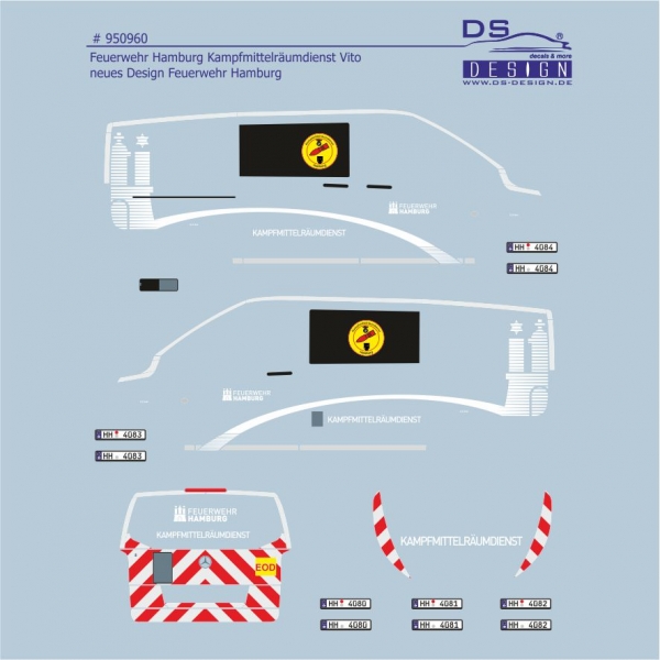 Der Kampfmittelräumdienst der Feuerwehr Hamburg hat Zuwachs bei den Fahrzeugen. Der MB Vito ist im neuen Design der Feuerwehr Hamburg beklebt. Das Decal enthält alle Details um das Modell vorbildgerecht gestalten zu können.