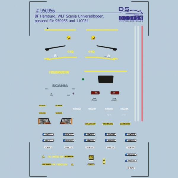 Die Feuerwehr Hamburg hat 6 neue Scania P410 WLF (Wechselladerfahrzeuge) in Dienst gestellt. Davon sind 5 baugleiche Fahrzeuge ohne Kran und einer mit Kran ausgestattet. Die Beschriftung ist passend für die leuchtroten Flächen # 950955 und unsere eigene Kabine Scania P410 # 110034. Im Decal sind alle Kennzeichen und Fahrzeugkennungen ausgeführt. Sie können also Ihr persönliches Modell bauen, oder gleich alle 6.