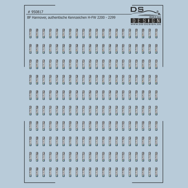 Bei dem Decal # 950817 handelt es sich um authentische Kennzeichen der Berufsfeuerwehr Hannover. Wir bieten dieses Decal zur vorbildkonformen Gestaltung Ihrer Modelle an.