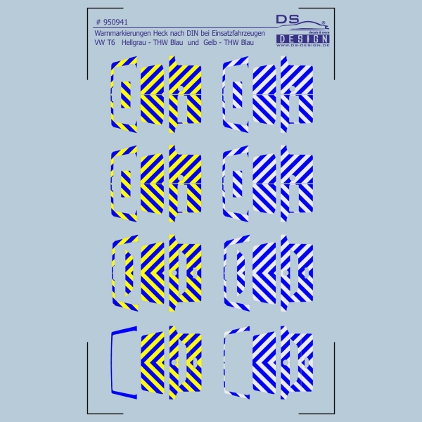 Das Decal # 950941 bildet die Heckwarnmarkierungen des VW T6 in den verschiedensten Versionen ab. Es wird in Hellgrau-THW Blau und Gelb-THW Blau abgedruckt. Das Decal ist für Basismodelle der Fa. Herpa vorgesehen.