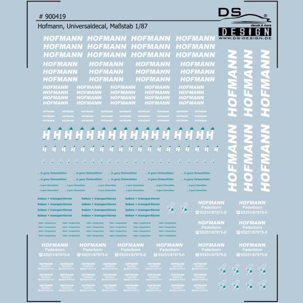 Das Decal # 900419 Hofmann Schwerlast Paderborn im Maßstab 1/87 ist ideal zur Bestückung von Großserienmodellen und ist den abgedruckten Größen universell verwendbar.