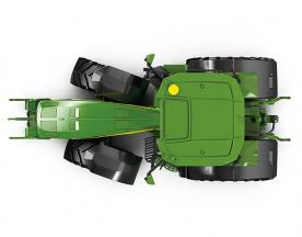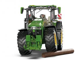 Die nach vorn abfallende Haube, dahinter die markant eckige Kabine: Der John Deere 8R 410 besitzt ohne Frage Eigenständigkeit. Das beweist auch das 1:32-Präzisionsmodell, das WIKING in ganzer Vorbildanmutung vorstellt. Die Kooperation von John Deere mit BMW Designworks in Kalifornien macht es möglich, dass sich der neue 8R schon auf Anhieb von der übrigen Typenpalette abhebt. Auch der Blick unter die Motorhaube des Modells macht deutlich, dass die WIKING-Konstrukteure dem mächtig Kraft spendenden Aggregat reichlich Aufmerksamkeit widmeten. Der 8R arbeitet in Wirklichkeit mit dem leistungsstarken Sechszylinder von Deere Power Systems (DPS) mit respektablen 9,0 l Hubraum, der 8R 410 verfügt sogar über einen Doppelturbo. Damit leistet das Vorbild als Topmodell der Baureihe 302 kW/410 PS Nenn- und 326 kW/443 PS Maximalleistung. Wie es sich für eine authentische 1:32-Miniatur gehört, ist die Motorhaube zum Öffnen angelegt.