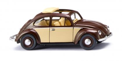 Den Käfer gab’s einst im edlen Auftritt: Mit dem Charme der sechziger Jahre konnte das Vorbild des WIKING-Käfers dank schokobraunem Lack überzeugen. Besonders auffällig: Die seitlich elfenbein lackierten Flanken bei gleichfarbigem Rollverdeck. Der Wolfsburger Dauerläufer, der seit 75 Jahren das Programm der WIKING-Verkehrsmodelle begleitet, ist auch als 1200er nicht aus dem Klassiker-Sortiment wegzudenken. Karosserie schokoladenbraun, Scheinwerfer glasklar eingesetzt. Schwarzes Fahrgestell mit silbernen Stoßstangen. Faltdach sowie Inneneinrichtung mit Lenkrad, Armaturenbrett und inneren Seitenteilen elfenbein gehalten. Felgen schokobraun mit silberner Buckelkappe. Frontscheinwerfer mit silbernem Hintergrund. Fronthaube mit silbernem VW-Logo sowie mittiger Zierleiste und Kofferraumgriff. Seitliche Flanken mit Elfenbein-Flächen sowie gesilberten Zierleisten und Türgriffen. Rückleuchten karminrot bedruckt.