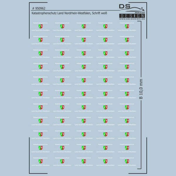 Das Decal # 950962 bildet das Wappen des Katastrophenschutz des Landes Nordrhein-Westfalen mit der Schriftfarbe weiß in einer Breite von 10 mm ab. So können verschiedene Modelle entsprechend vorbildkonform beschriftet werden.