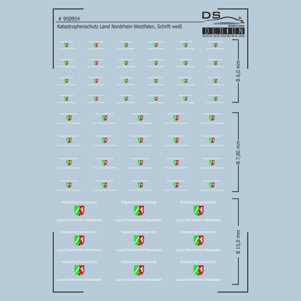 Das Decal # 950954 bildet das Wappen des Katastrophenschutz des Landes Nordrhein-Westfalen mit der Schriftfarbe weiß in verschiedenen Größen ab. So können verschiedene Modelle entsprechend vorbildkonform beschriftet werden. Die Maße sind entsprechend in dem Decal angegeben und es ist für den Maßstab 1/87 vorgesehen..