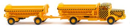 Der WIKING-Seitenkipper führte lange in der Markengeschichte ein Schattendasein – bis heute. Denn mit dem Büssing 8000 machen die Traditionsmodellbauer aus dem Seitenkipper einen respektablen Kipperhängerzug. Ganz in Gelb versteht sich und dazu noch mit auffällig schwarzer Schraffur-Optik, die damals in Steinbrüchen und auf Straßenbaustellen gar nicht selten war. Die Traditionsmodellbauer rüsten damit den Büssing 8000 erstmals mit dieser Aufbauten-Kombination nach Vidal-Vorbild aus. Verkehrsgelbes Fahrerhaus mit basaltgrauem Interieur. Warndreieck verkehrsgelb eingesteckt. Fahrgestell mit Kotflügel, Trilexfelgen und Kippmuldenaufbau verkehrsgelb. Fahrerhaus mit Haube sowie seitlicher Kipper mit schwarzer Warnschraffur. Scheinwerfer vorn gesilbert. Anhänger mit verkehrsgelbem Fahrgestell, Trilexfelgen, Deichsel und Muldenaufbau. Seitlich schwarze Warnschraffur.