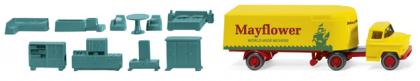 Seitlich verkehrsroter Schriftzug „Mayflower“ mit smaragdgrüner Kontur. Darunter smaragdgrüner Schriftzug “World-Wide Movers“. Kofferbedruckung vorn und hinten mit verkehrsrotem Schriftzug „Mayflower“ und smaragdgrüner Kontur. Möbel türkisblau im Zubehörbeutel beiliegend.