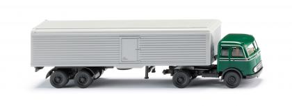 Mit der Zugmaschine und dem Fernfahrerhaus des Mercedes-Benz Pullman – ebenfalls aus neuen Formen mit historischer WIKING-DNA – entsteht ein wunderschönes Lkw-Gespann, wie man es sich schon lange gewünscht hat. Fahrerhaus moosgrün, Inneneinrichtung olivbraun. Fahrgestell, Kardanwelle und Felgen anthrazitgrau. Scheinwerfer frontseitig silbern handbemalt, Rückleuchten rot bedruckt. Grillfläche schwarz mit silbernen Zierleisten und Mercedes-Benz-Stern. Blinker signalorange, Doppelzierstreifen silbern gehalten. Auflieger mit anthrazitgrauem Fahrgestell, Kotflügeln, Stützrollen und Felgen. Koffer mit Türen silbergrau. Heckseitige Rückleuchtenbedruckung.